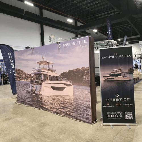Para Yachting México desarrollamos un stand elegante y funcional que permitió destacar la embarcación como el elemento principal del espacio, generando una experiencia visual impactante para los visitantes desde el primer momento.