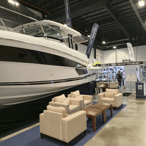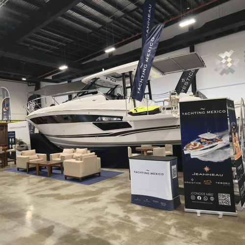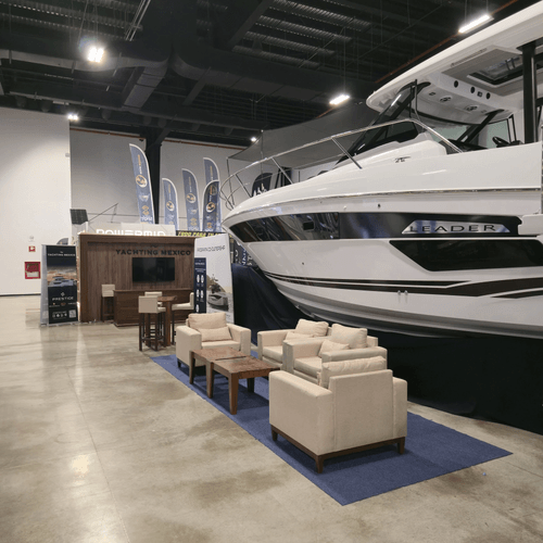 El diseño se complementó con una zona lounge con sillones y mesa de centro sobre alfombra, pensada para recibir prospectos y sostener conversaciones comerciales en un ambiente cómodo. En la parte posterior se integró un muro con acabado en madera con la marca Yachting México y una pantalla, funcionando como punto de identidad visual y apoyo para mostrar contenido audiovisual de sus embarcaciones.